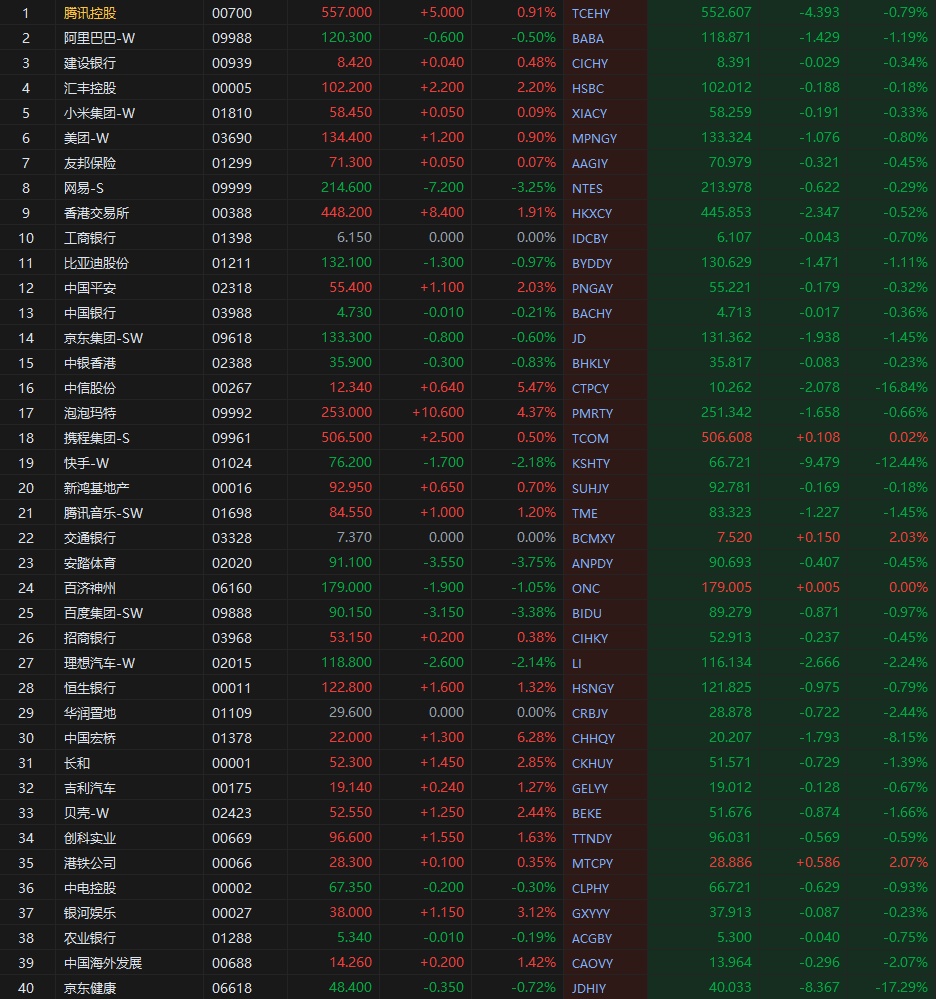 大型蓝筹股涨跌不一,汇丰控股收报102.012港元,较香港收市跌0.18%;腾讯控股收报552.607港元,较香港收市跌0.79%。