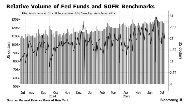这个自1980年代沿用至今的基准利率,被视作美联储调控经济信贷流量的工具。但如今真正的调控阀门已转变为包括准备金余额利率(IORB)在内、由美联储直接设定的一系列管理利率。尽管联邦基金利率理论上应在25个基点的目标区间内波动,但过去两年除政策利率调整外几乎纹丝不动——截至7月23日仍维持在4.33%。而隔夜一般抵押品回购协议利率等指标却呈现显著波动,暗示回购市场或许更能真实反映资金流向。