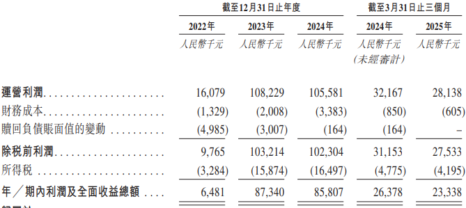 财务方面,于2022年度、2023年度、2024年度及2025年截至3月31日止三个月,该公司实现收入分别约为3.30亿元、5.87亿元、7.98亿元、2.21亿元人民币;同期,年内利润及全面收益总额分别为648.1万元、8734万元、8580.7万元、2333.8万元人民币。