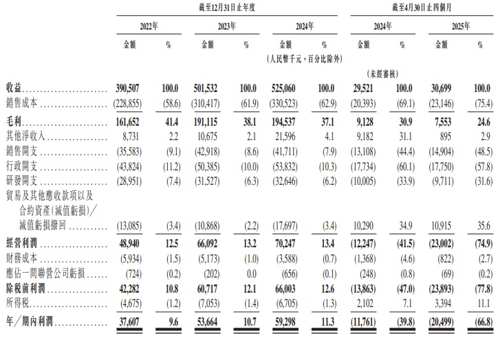 财务方面,于2022年度、2023年度、2024年度及2025年截至4月30日止四个月,该公司实现收益分别约为3.91亿元、5.02亿元、5.25亿元、3069.9万元人民币;同期,年内利润分别为3760.7万元、5366.4万元、5929.8万元、-2049.9万元人民币。
