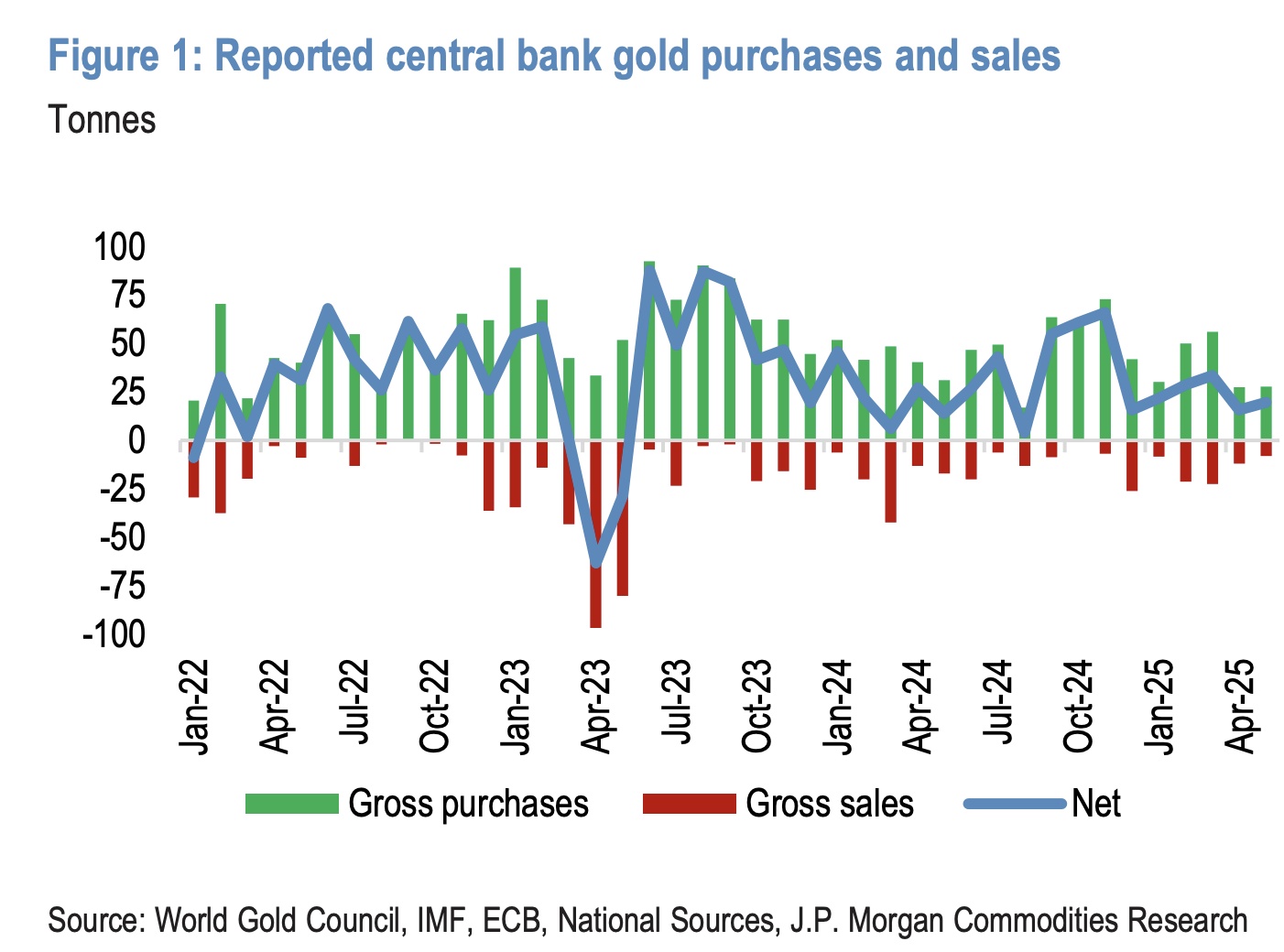 央行购金依然保持强劲势头。5月份(最新完整数据月份),报告的央行黄金购买量环比上升至20吨,2024年前5个月的购买量同比增长约4%。中国央行继续购金,6月份报告增加约2吨。