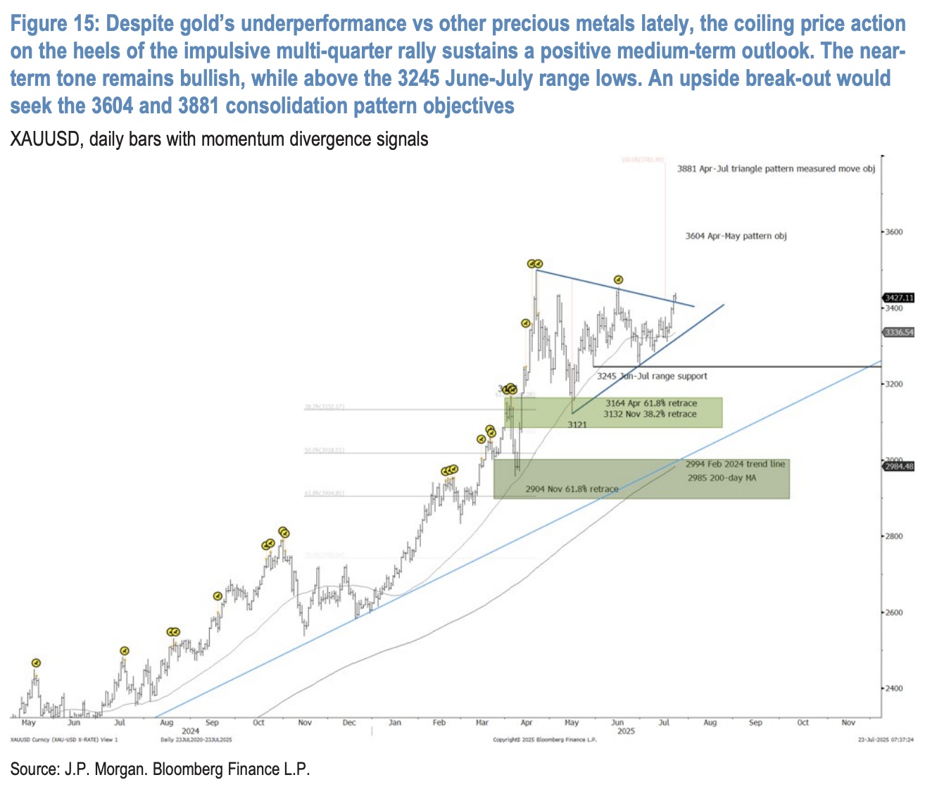 从技术指标来看,摩根大通表示,黄金数月来的盘整走势在中期前景中保持积极,关键支撑位在3245美元/盎司,向上突破将寻求3604美元和3881美元的整固形态目标。