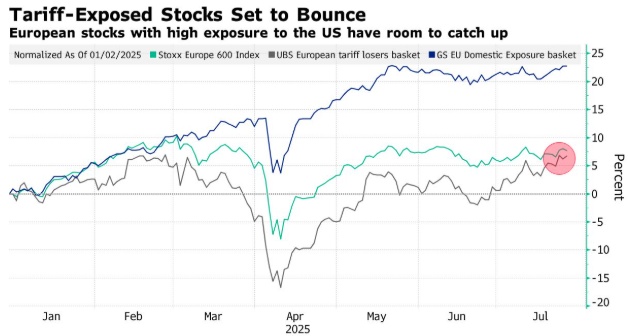 自 5 月以来,欧洲股市一直处于区间波动状态,原因是全球贸易前景引发的担忧情绪影响了市场。目前,斯托克 600 指数较其 3 月份的历史高点低了 2.3%。瑞银编制的一个受关税影响较大的股票指数今年的表现逊于整体市场基准,这表明该板块仍有追赶整体地区基准的潜力。周一,受贸易影响最大的板块,如汽车和消费品板块,其表现预计将优于上周五,因为投资者认为在 8 月 1 日的关税截止日期前能够达成协议。