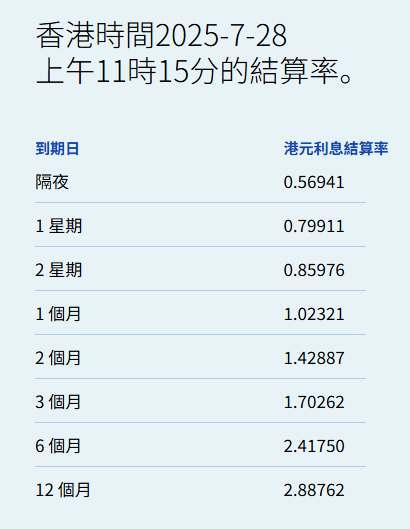 智通财经APP获悉,7月28日,港元拆息几乎全线上升,隔夜息报0.56941%,升30.084基点,是5月7日后最高;一周拆息升35.459基点,报0.79911%,两周则升25.976基点,报0.85976%;与楼按相关的一个月拆息报1.02321%。