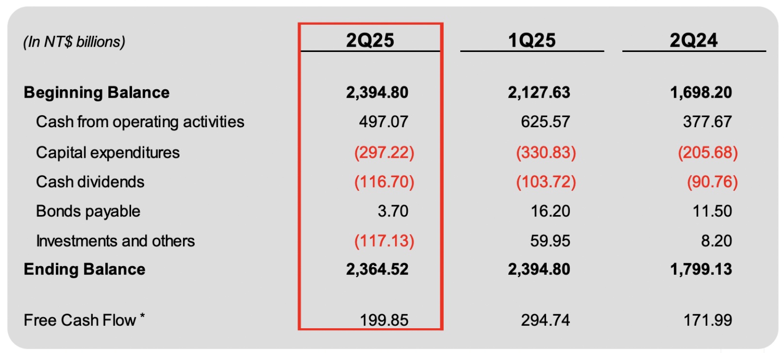 现金流方面,公司本季度经营性现金流达5000亿新台币(约合160亿美元),股息收益率仅1.2%,虽足以覆盖分红,但资本支出高达94亿美元。2025年预计资本支出将达400亿美元,按此测算年化自由现金流(FCF)约250亿美元,自由现金流收益率低于3%。
