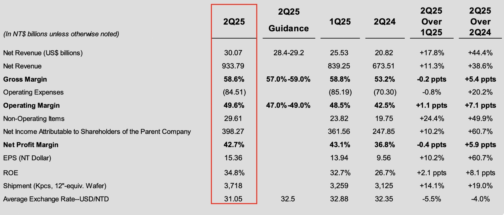 客户需求大幅增长,台积电本季度营收同比增幅超40%。毛利率同步提升超5个百分点,显示其产品定价能力增强;晶圆出货量增长19%,推动净利润率接近43%。尽管新台币兑美元汇率走强对以新台币计价的盈利造成一定压力,但整体现金流仍保持稳健。不过环比数据透露出需求放缓迹象:毛利率与净利润率均现环比下降,表明持续涨价的难度增加。