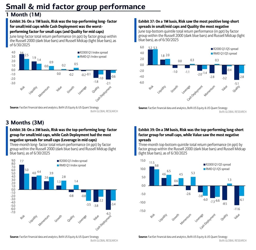 结合因子角度,二季度小盘股中动量(Momentum)、质量(Quality)因子一度失灵,风险因子一枝独秀,但这种异常状况预计不会长久。随着投机热潮退去,美银预计量子因子重新聚焦于基本面趋势:真正业绩向好的中小盘股有望成为新的动量领袖。质量因子则有望回归长期绩优地位——一旦市场重拾理性,财务健康、收益稳定的公司股价应更具持续上涨动力。相反,高风险因子(如高杠杆、高波动)在经历大涨后,其回撤风险正不断累积。美银策略预期未来中小盘市场将从“低质量领跑”切换到“高质量稳健上涨”的新阶段,投资者应提前布局这个转变。