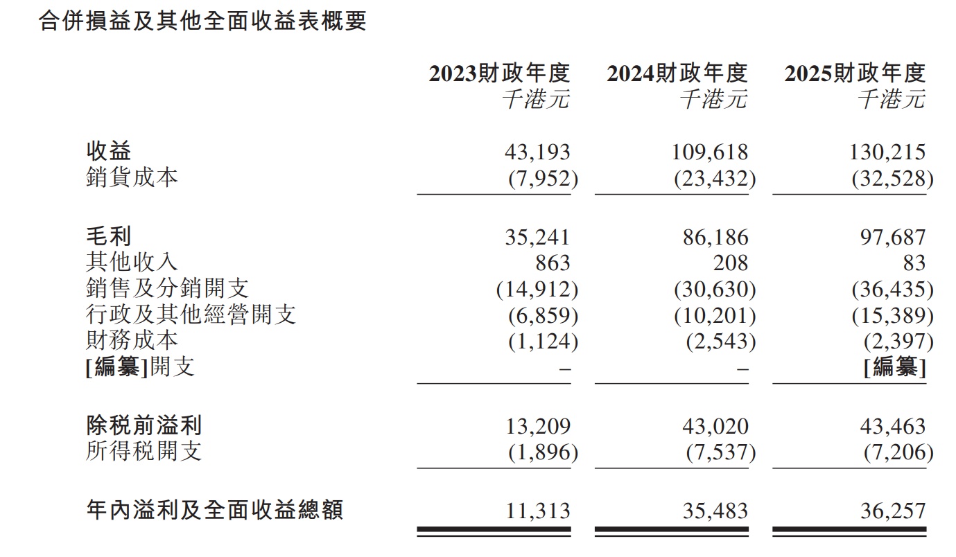 财务方面,于2023财政年度、2024财政年度、2025财政年度,该集团实现收益分别约为0.43亿港元、1.10亿港元、1.3亿港元;同期,年内溢利及全面收益总额分别约为1131.3万港元、3548.3万港元、3625.7万港元。