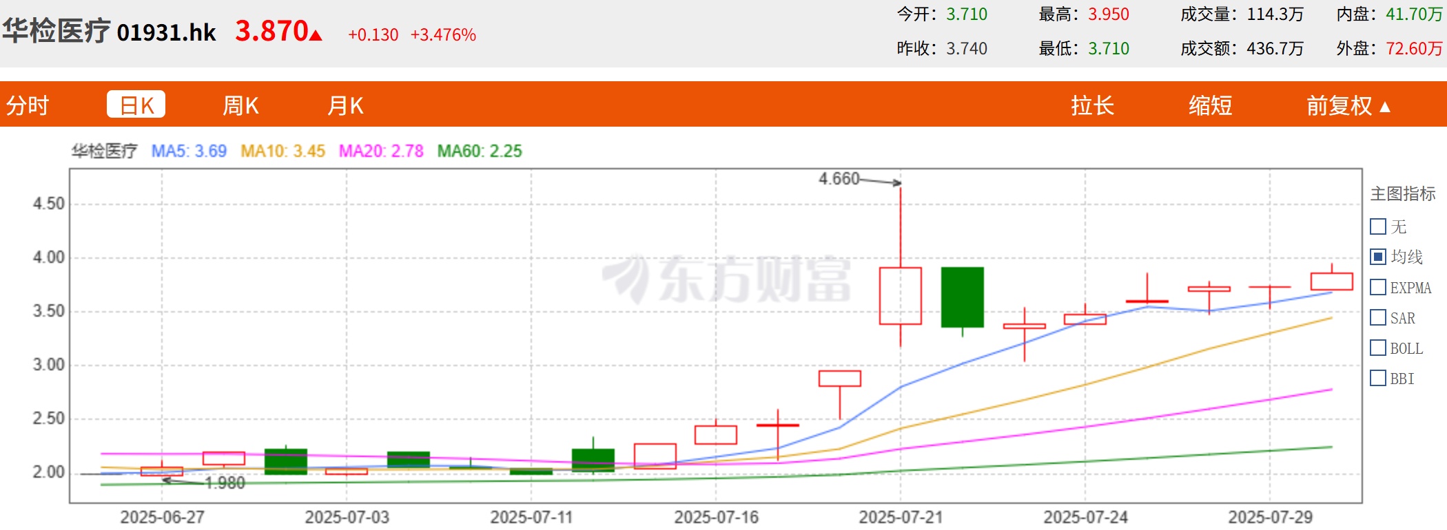 战略的颠覆性迅速在资本市场激起涟漪。7月14日至21日,华检医疗股价涨幅高达75%,市值突破60亿港元。7月21日早盘更一度暴涨53.9%,触及4.66港元历史最高价位,市场情绪近乎沸腾。
