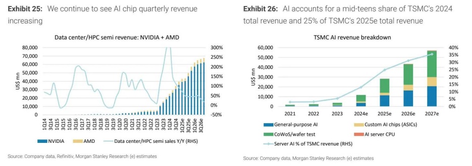 摩根士丹利还强调,AI供应链的扩张不仅体现在芯片和封装环节,从GPU到ASIC的租赁价格、企业营收结构也印证了行业热度。英伟达和AMD的数据中心半导体收入持续增长,台积电2025年AI相关收入占比预计达25%,较2024年的约15%水平显著提升。总的来说,该行认为,台积电的CoWoS产能扩张、HBM技术的进步以及科技巨头的资本支出增长,将成为行业的主要驱动力。