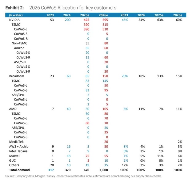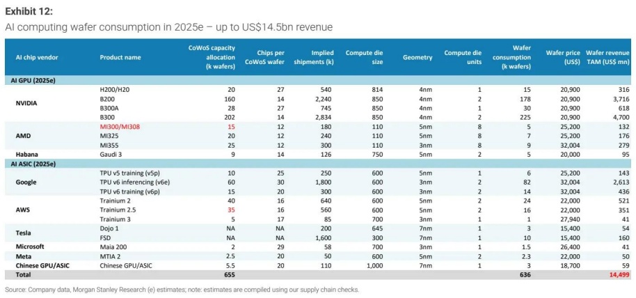 产业链其他企业也在加速布局:因亚马逊(AMZN.US)AWS Trainium3的快速放量,摩根士丹利将Alchip的CoWoS订单预测从4万片上调至5万片;该行预计迈威尔科技(MRVL.US)将为AWS Trainium2.5和微软(MSFT.US)Maia300分别预留3万片和2.5万片产能;联发科则预计将在2026年下半年启动CoWoS订单,初期规模约2万片。