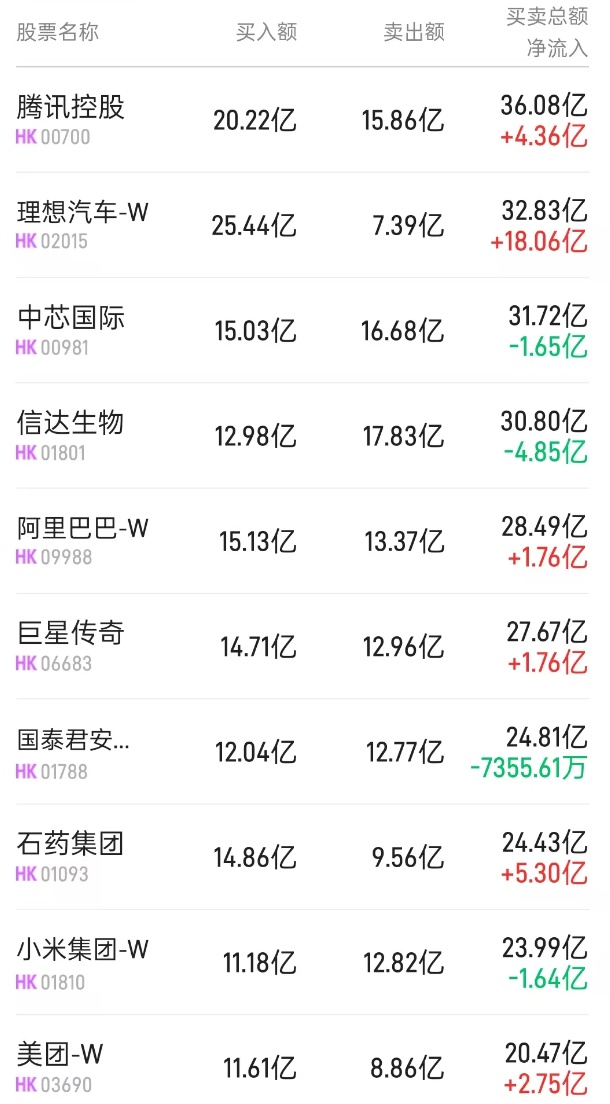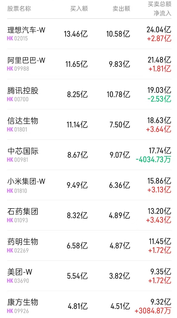 北水净买入最多的个股是理想汽车-W(02015)、石药集团(01093)、美团-W(03690)。北水净卖出最多的个股是中芯国际(00981)、信达生物(01801)、国泰君安国际(01788)。