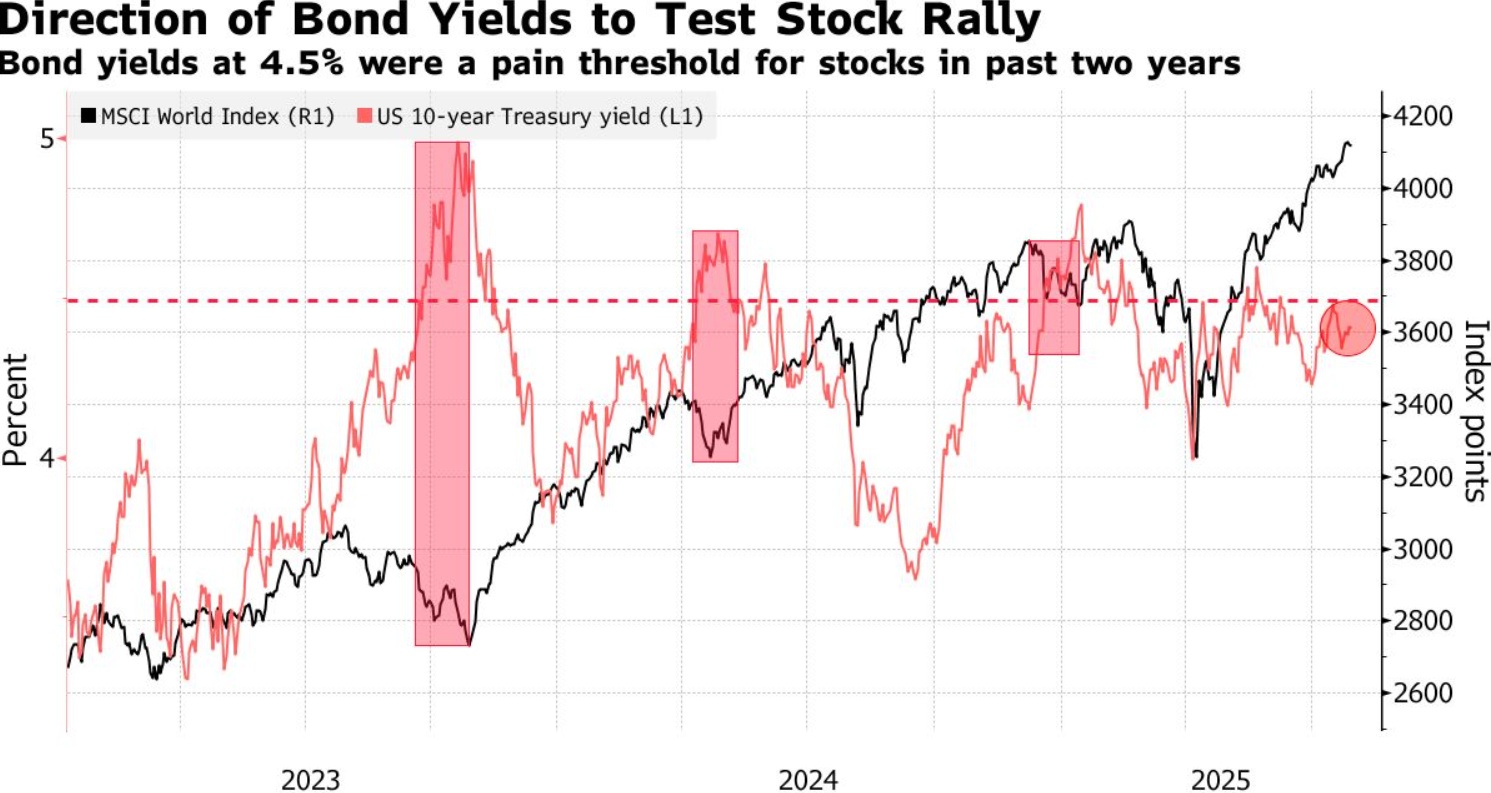 本周还将迎来一系列非常关键的美国经济数据,以及日本央行利率决议。就目前来看,投资者们似乎并不担心有着“全球资产定价之锚”称号的10年期美债收益率目前在4.3%-4.5%附近的历史高位水平——按照历史规律,这一收益率水平对股票市场投资者而言应当“高得令人抛售股票”。