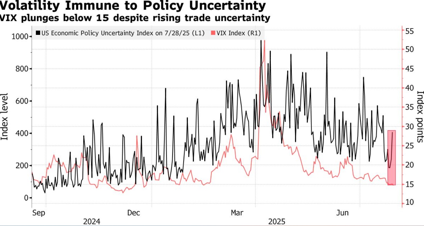 对于接下来货币政策以及特朗普关税政策具体走向的疑虑并未消失。美国政府与欧盟周日达成极具争议的初步贸易协议后,全球经济政策不确定性指数飙升,但股市波动率再度无动于衷。Cboe Volatility波动率指数(即VIX恐慌指数)近期一度跌破15,并在周一收于年内最低位附近。