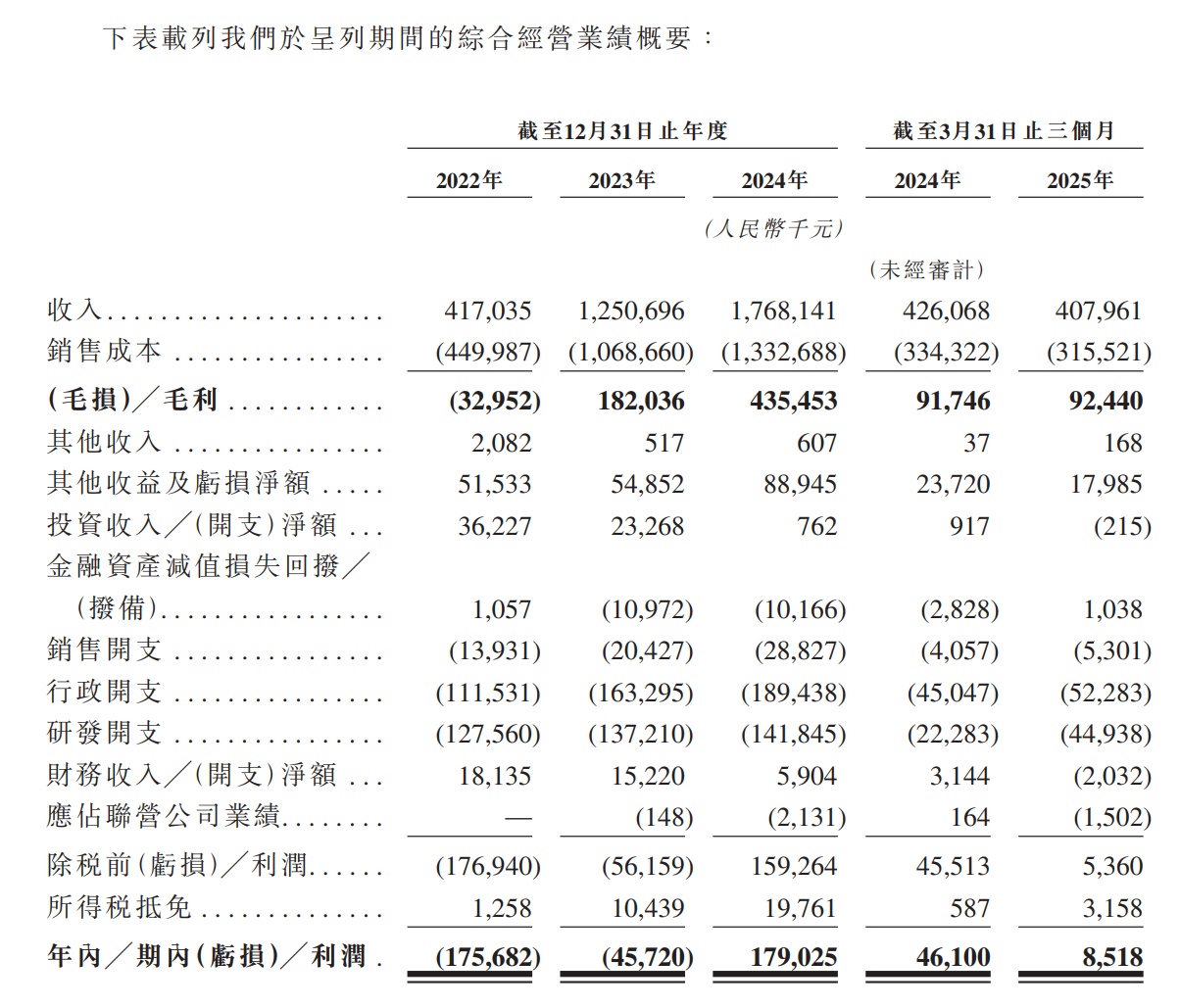 财务方面,于2022年度、2023年度、2024年度、2025年截至3月31日止三个月,天岳先进实现收入分别约为4.17亿元、12.51亿元、17.68亿元、4.08亿元人民币;同期,公司实现利润分别约为-1.76亿元、-0.46亿元、1.79亿元、0.09亿元人民币。