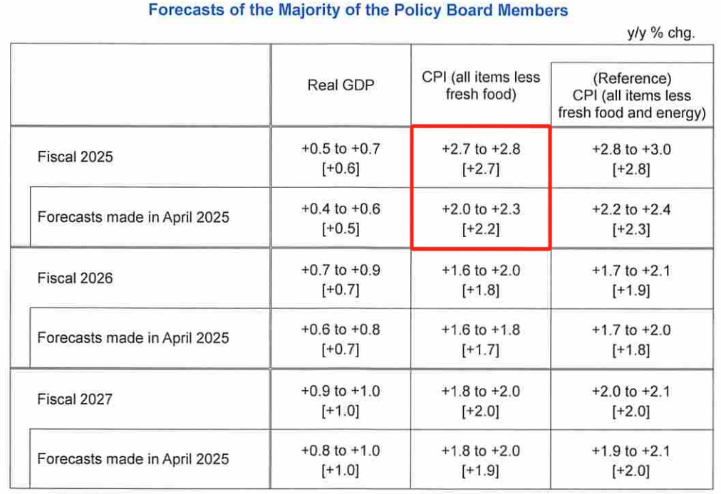 日本央行九人货币政策制定委员会在其季度经济展望报告中将本财政年度的平均通胀预期从 2.2%上调至 2.7%,这反映了食品价格的持续上涨,经济学家的预期为略微上调至2.5%。此外,该委员会还略微上调了 2026 年和 2027 年的通胀预期,并将今年的经济增长预期略微上调。