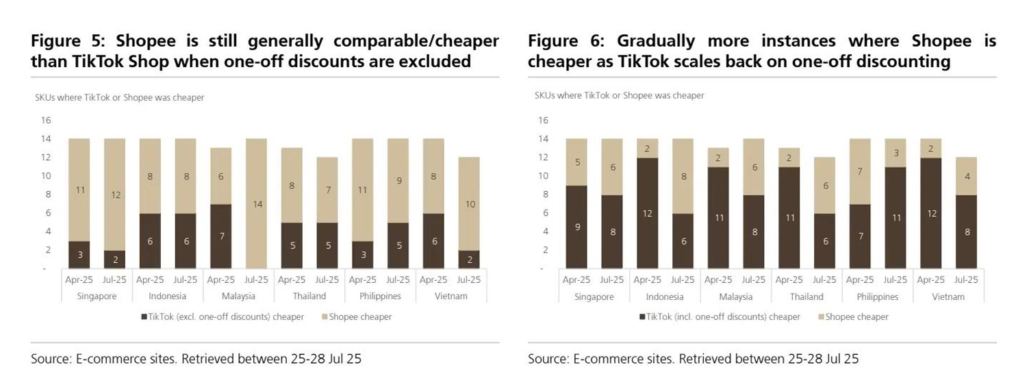 瑞银通过价格跟踪发现,东南亚主要电商平台之间的竞争正变得更加理性。瑞银调查数据显示,Shopee与TikTok Shop之间的价格差距正逐步缩小,这是因为TikTok Shop缩减了针对新用户的一次性大额折扣,不再一味以补贴抢占市场。这意味着整个市场的补贴大战有所缓和,各玩家开始注重可持续增长而非烧钱补贴。