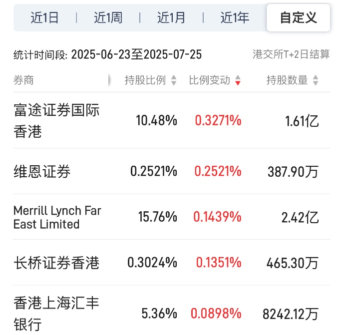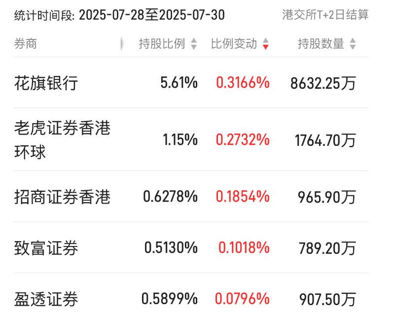 这一时期(7月28日至30日),买方席位前五名分别为花旗银行、老虎证券香港环球、招商证券香港、致富证券及盈透证券,持股比例分别增长0.3166%、0.2732%、0.1854%、0.1018%及0.0796%;卖盘前五分别为香港上海汇丰银行、中国银行(香港)、法国巴黎银行、耀才证券及中国国际金融香港证券,持股比例分别下降0.7762%、0.2179%、0.0999%、0.0758%及0.0650%。