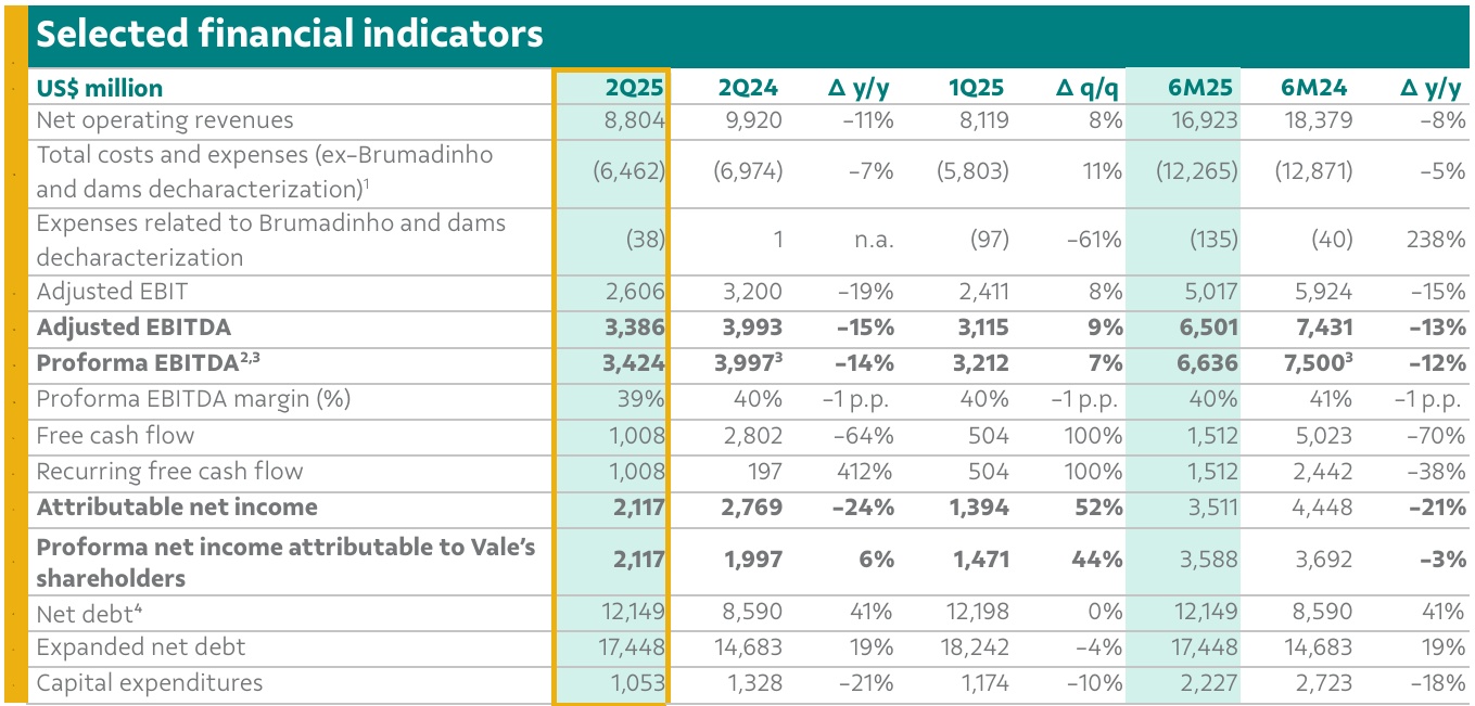 智通财经APP获悉,全球铁矿石巨头淡水河谷(VALE.US)公布的2025年第二季度业绩好于预期。尽管销量下滑、铁矿石价格疲软,但产量激增帮助提振了利润。财报显示,淡水河谷Q2营收为88.04亿美元,同比下降11%;归属于股东的净利润为21.17亿美元,同比增长6%。Pro Forma(形式上的)息税折旧摊销前利润(EBITDA)为34.24亿美元,同比下降14%,但好于市场预期的33.1亿美元;调整后的EBITDA为33.86亿美元,同比下降15%。