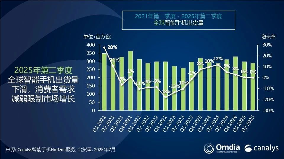 智通财经APP获悉,Canalys(现为Omdia的一部分)的最新研究,2025年第二季度全球智能手机出货量小幅下降至2.889亿部,受限于相对温和的消费者需求,市场增长受抑。许多厂商将押注于第三季度密集的新品发布季,重点聚焦于AI、折叠屏和轻薄设计等趋势,希望在年底假日购物季到来前激发消费需求。不过,考虑到消费者信心依然低迷,厂商在入市策略上仍需保持谨慎。