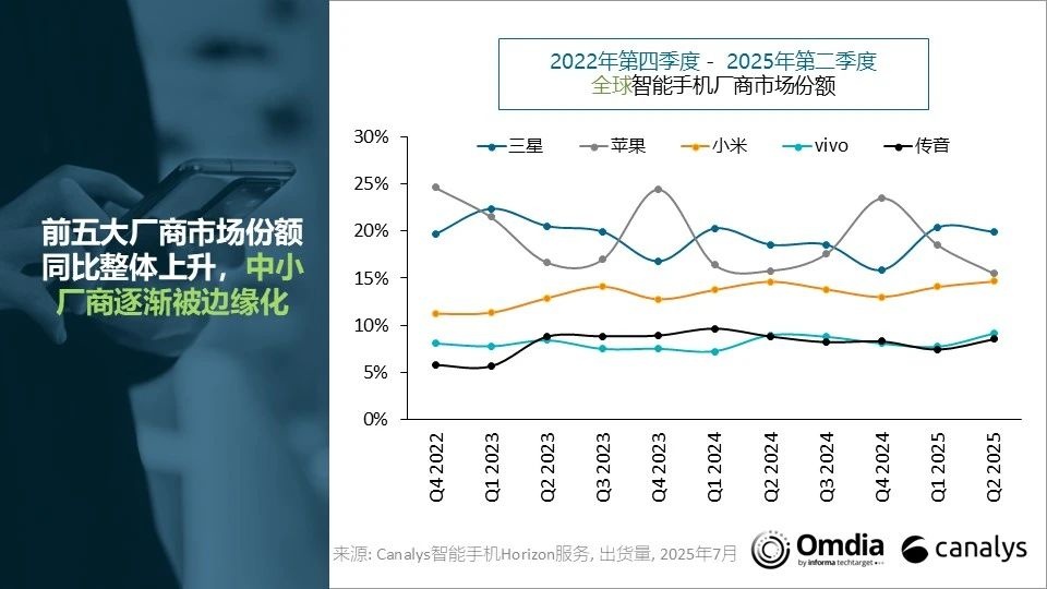 三星在本季度保持最大出货量厂商地位,出货5750万部,同比增长7%。其表现主要得益于面向大众市场的Galaxy A系列。苹果排名第二,iPhone出货量为4480万部,同比下降2%。尽管面临中国市场激烈竞争以及美国市场库存调整带来的挑战(主要由于快速变化的关税政策),苹果依然展现出强劲的韧性。vivo位列第四,同比增长2%,出货2640万部,印度市场增长尤为明显。传音排名第五,出货2460万部,同比下降3%。