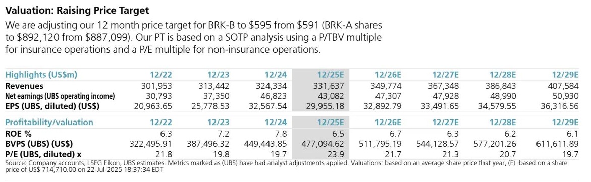 智通财经APP获悉,有着“股神”称号的沃伦·巴菲特旗下伯克希尔哈撒韦公司(BRK.A.US)将于周六公布业绩报告,国际大行瑞银(UBS)绩前发布看涨研报唱多该公司,并且押注巴菲特所掌舵的这家投资巨擘可能打破所谓的“八月魔咒”——即有望在标普500指数因高估值重压、关税导致的经济前景模糊以及季节性抛售因素共同来袭的八月疲软期实现大举逆势上行。瑞银在最新研报中将伯克希尔的12个月目标股价小幅上调至595美元(B股),对应A股约892,120美元,并重申对伯克希尔的“买入”评级。截至周四收盘,伯克希尔B股收于471.88美元。
