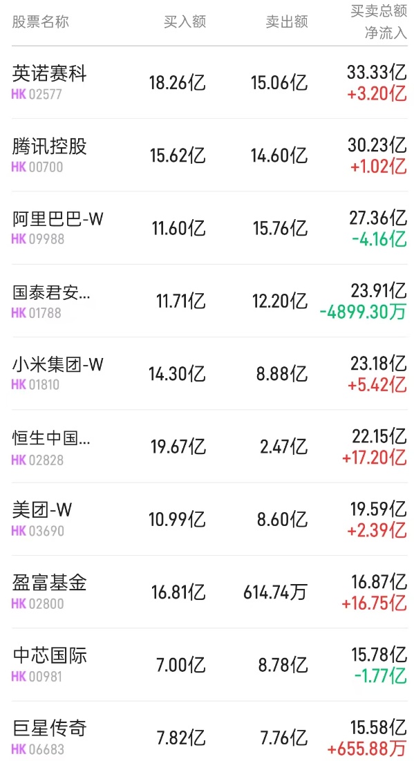 此外,石药集团(01093)、巨星传奇(06683)分别获净买入2.52亿、655万港元。而信达生物(01801)、中芯国际(00981)分别遭净卖出4.02亿、1.77亿港元。