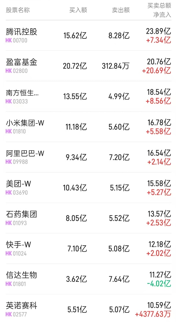 北水净买入最多的个股是盈富基金(02800)、恒生中国企业(02828)、小米集团-W(01810)。北水净卖出最多的个股是信达生物(01801)、阿里巴巴-W(09988)、中芯国际(00981)。