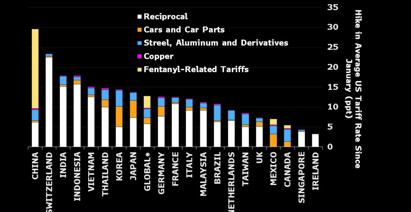 历经数月谈判——期间特朗普在社交媒体上同时威胁美国盟友和竞争对手们,最终出台的新税率大体与4月2日“解放日”公布但因股市暴跌和债券收益率飙升而暂缓实施的对等关税水平相当或略低。不过,仍有一些令人震惊的举措,例如对瑞士进口商品意外征收惩罚性39%的税率,以及对部分加拿大商品的税率提高至35%。