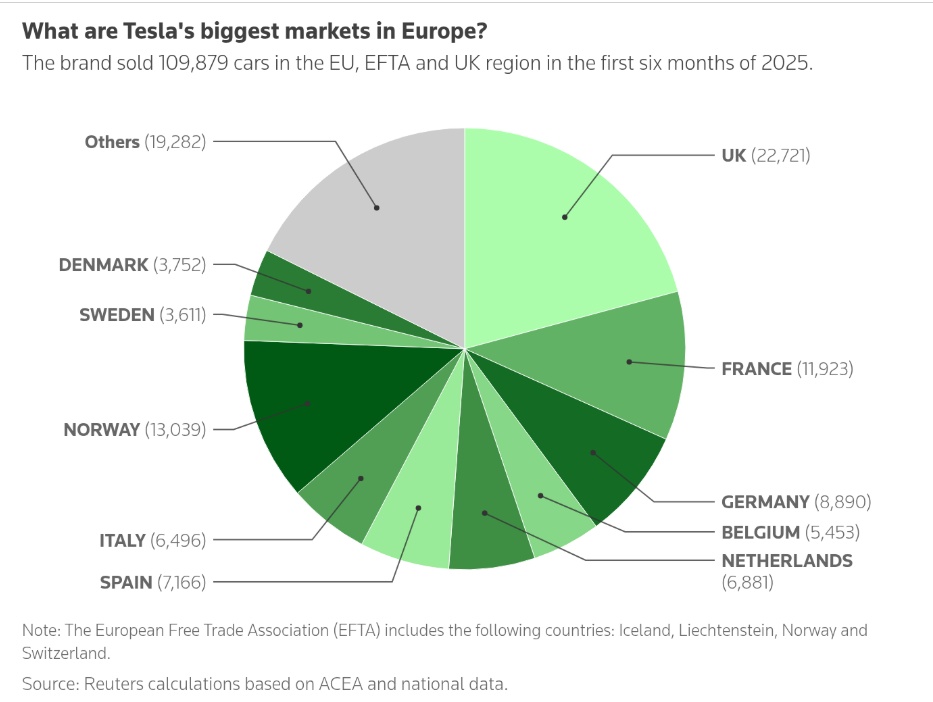 欧洲的官方行业注册数据显示,特斯拉品牌的注册量(这一数据与销量紧密相关)在欧洲继续萎缩,在7月呈现出同比暴跌:在瑞典市场大降86%至163辆,丹麦降52%至336 辆,法国降 27%至1,307辆,荷兰降62%至443辆。这些欧洲长期以来对于汽车需求最强劲的国家已连续七个月录得特斯拉电动汽车注册量下滑。