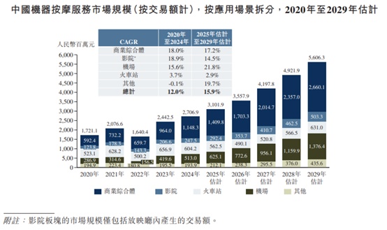 根据弗若斯特沙利文的资料,中国智能按摩服务市场规模从2020年的人民币17.21亿元增长至2024年的人民币27.07亿元,CAGR为12.0%,预计将从2025年的人民币31.02亿元增长至2029年的人民币56.06亿元,期间CAGR为15.9%。