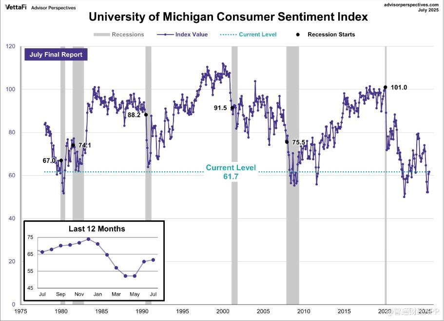 从历史角度来看,当前61.7的指数远低于历次经济衰退初期的水平。数据显示,自1978年以来,密歇根消费者信心指数的平均值为84.4,而当前读数则分别低于这两个平均值26.9%和25.9%。在过去571个月的数据中,目前的61.7仅处于第6百分位,凸显当前信心之低。