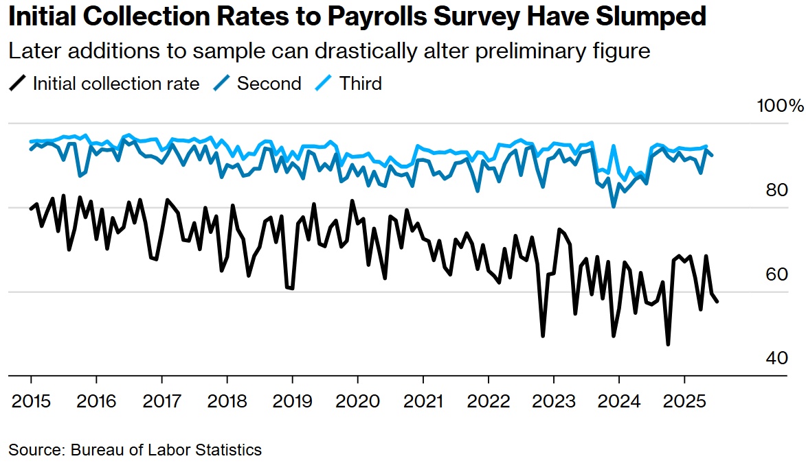 劳工统计局在三个月周期内对企业进行薪资调查,随着更多企业回复会获得更完整图景。但首次调查的回复率持续萎缩,近月初始收集率屡次跌破60%——远低于疫情前约70%的常态水平。