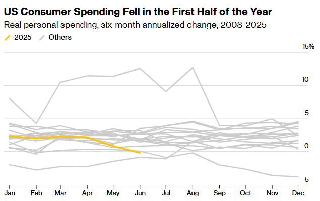 上周五公布的非农就业数据表明,当前美国劳动力市场的状况比此前报告的情况要糟糕得多。经通胀调整后的消费者支出(约占美国经济活动的三分之二)在今年上半年出现了下降,而美联储青睐的通胀指标则在 6 月份有所回升。