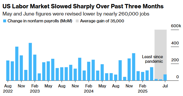 上周五公布的就业数据震惊了市场,包括对此前数据的修正——将 5 月和 6 月的就业岗位数下修了近 26 万,并颠覆了人们此前对于夏季前劳动力市场依然稳健的看法。过去三个月的就业增长平均仅为 3.5 万个,这是自疫情以来最糟糕的水平。