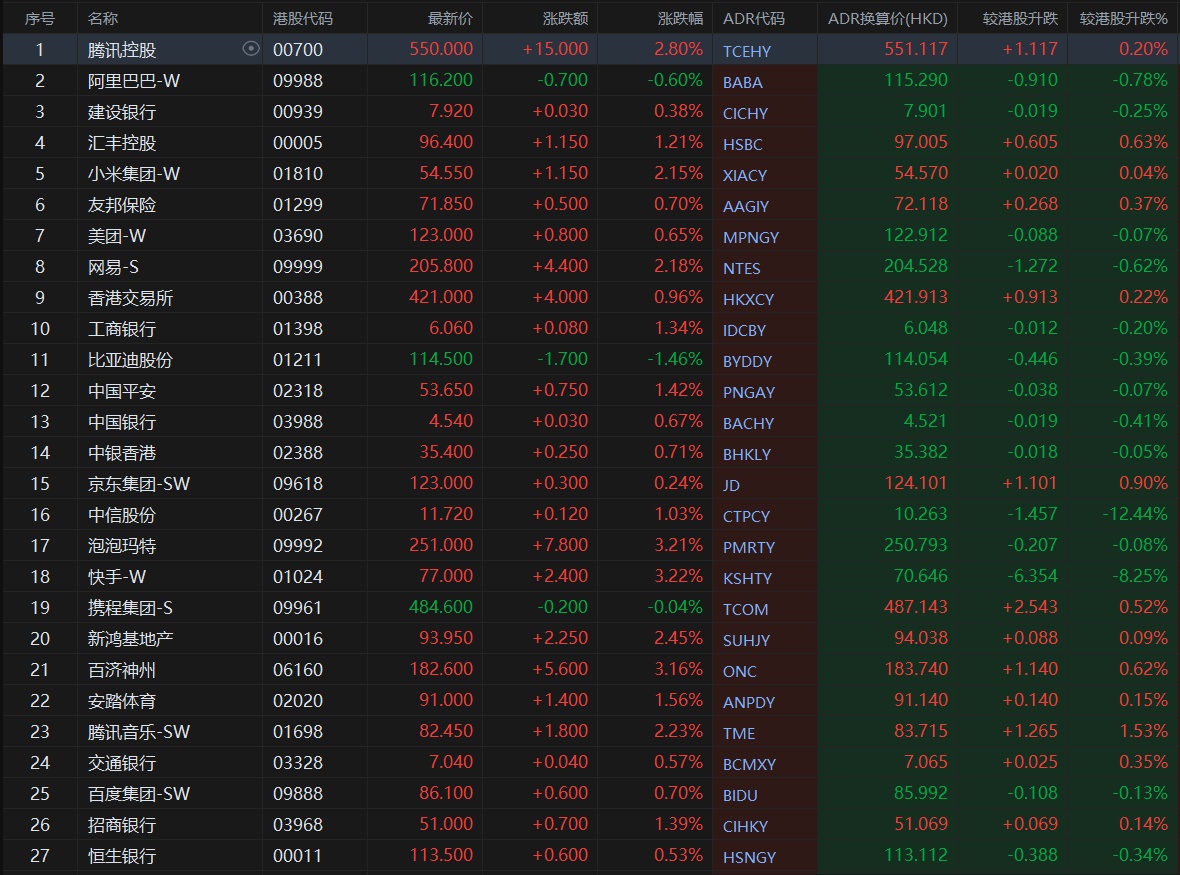 大型蓝筹股涨跌不一,汇丰控股收报97.005港元,较香港收市涨0.63%;腾讯控股收报551.117港元,较香港收市涨0.20%。