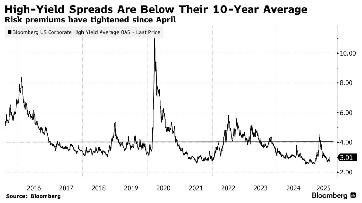 该行策略师马修·米什及其团队在周一的报告中称,美国高收益债券市场的风险溢价(即投资者持有此类债券而非国债所要求的额外收益率)目前仅比十年低点高出不到0.5个百分点。