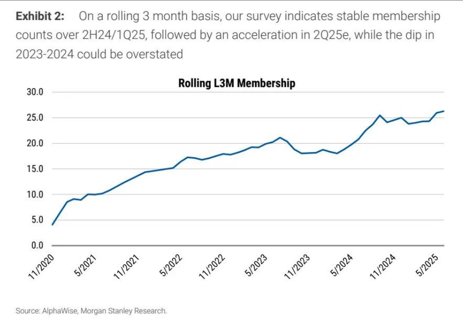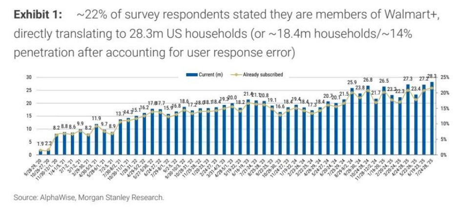 根据摩根士丹利AlphaWise月度消费者脉动调查数据,7月Walmart+的会员数量达到约2830万(经用户响应误差调整后为1840万),相当于美国约22%的家庭渗透率(调整后为14%)。这一数字较6月环比增长110万,是自2020年9月调查启动以来的最高纪录。以滚动三个月为统计周期,Walmart+会员数量同比增长约27%。尽管摩根士丹利指出,由于抽样误差可能导致绝对增长率被高估(2023年基数或被低估),但这一增长趋势与沃尔玛管理层在2025年持续推动会员增长的战略重点相符。