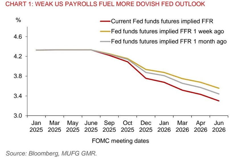 MUFG表示,因就业数据被大幅下修,总统特朗普解雇劳工部统计局局长,并加大对美联储主席鲍威尔的批评力度,要求其辞职并且建议美联储理事会夺回控制权,这标志着特朗普政府对于美联储货币政策独立性的压力升级。因此在MUFG策略团队看来,特朗普政府解雇劳工统计官员+要求美联储主席鲍威尔辞职,势必将推动美联储内部的鸽派声音抬头,进而有可能响应市场愈发升级的降息预期。