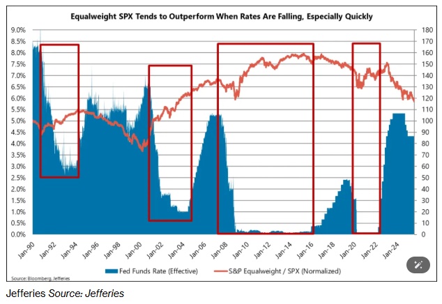 具体来说,杰富瑞汇编的数据显示,在过去四轮降息周期中,标普500等权重指数在一年期的表现上平均领先标普500指数0.6%,在两年期领先约4%,而在四年期则平均领先12.5%。