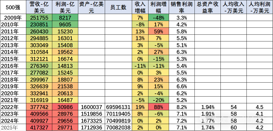 此次上榜门槛(最低销售收入)从321亿美元增长至322亿美元。所有上榜公司的净利润总和同比增长约0.4%,约为2.98万亿美元。500家上榜公司的资产总额和净资产总额均达到自《财富》世界500强排行榜创立以来的最高峰,但雇佣员工总数相比去年有所下降。