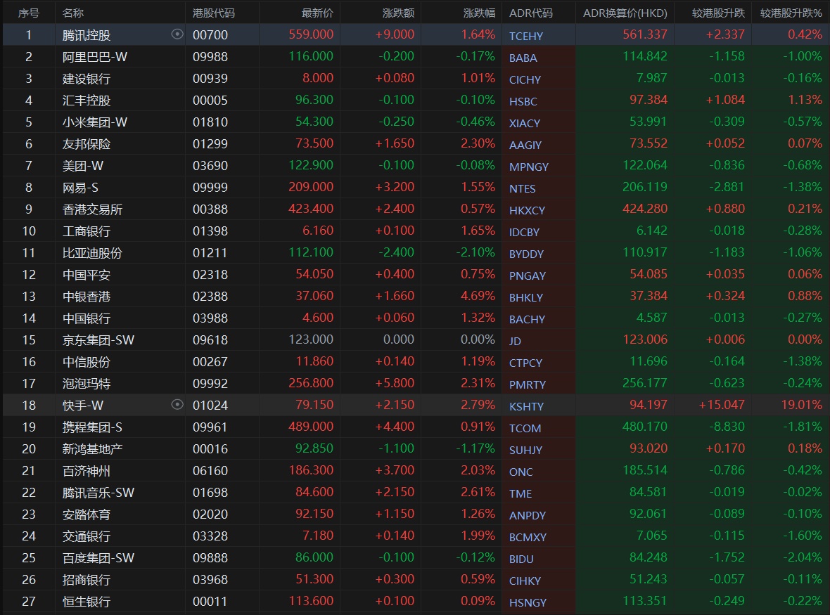 大型蓝筹股涨跌不一,汇丰控股收报97.384港元,较香港收市涨1.13%;腾讯控股收报561.337港元,较香港收市涨0.42%。