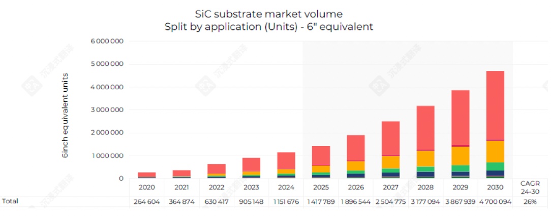 Yole的报告显示,全球功率碳化硅器件市场规模预计到2030年将达到103亿美元,对应2024-2030年的复合年增长率为20.3%。受益于下游市场对碳化硅器件的需求持续增长,产业链上游也将稳步扩容。毋庸讳言,现阶段以特斯拉为代表的电动汽车公司增速放缓,以及由此引发的供应链库存调整,对碳化硅衬底市场产生了一定程度的扰动,不过这完全可以归因于成长节奏的问题,长期看碳化硅衬底的增长趋势并没有发生变化。报告预测,6英寸的衬底年出货量将从2024年的约115万片,增长至2030年的近470万片,期间复合年增长率高达26%,这其中风光储、AI数据中心乃至于电动汽车等仍将会是驱动衬底出货量增长的主要来源。