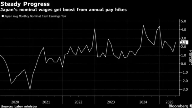 智通财经APP获悉,日本劳动者6月名义薪资创下四个月来最快增速,这既体现了年度劳资谈判中劳动者取得的成果,也引发了市场对于日本央行未来几个月可能加息的猜测。