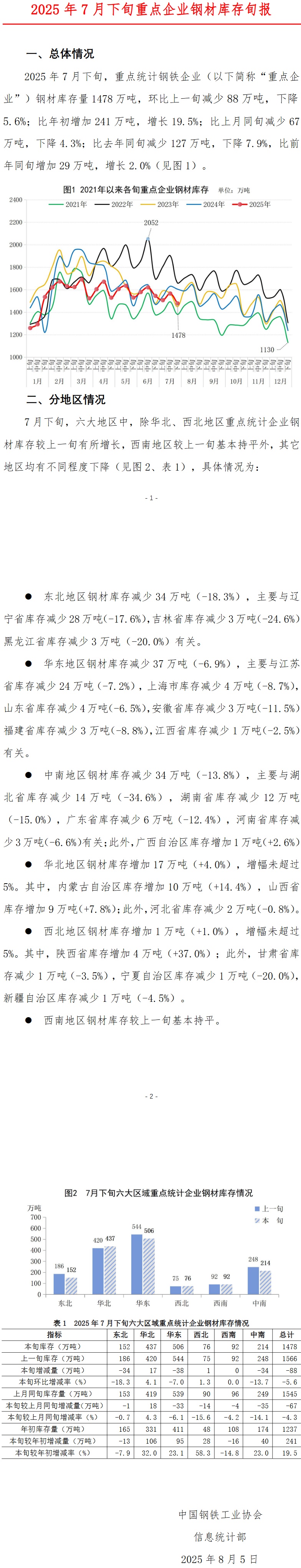 智通财经APP获悉,中钢协数据显示,2025年7月下旬,重点统计钢铁企业钢材库存量1478万吨,环比上一旬减少88万吨,下降5.6%;比年初增加241万吨,增长19.5%;比上月同旬减少67万吨,下降4.3%;比去年同旬减少127万吨,下降7.9%,比前年同旬增加29万吨,增长2.0%。