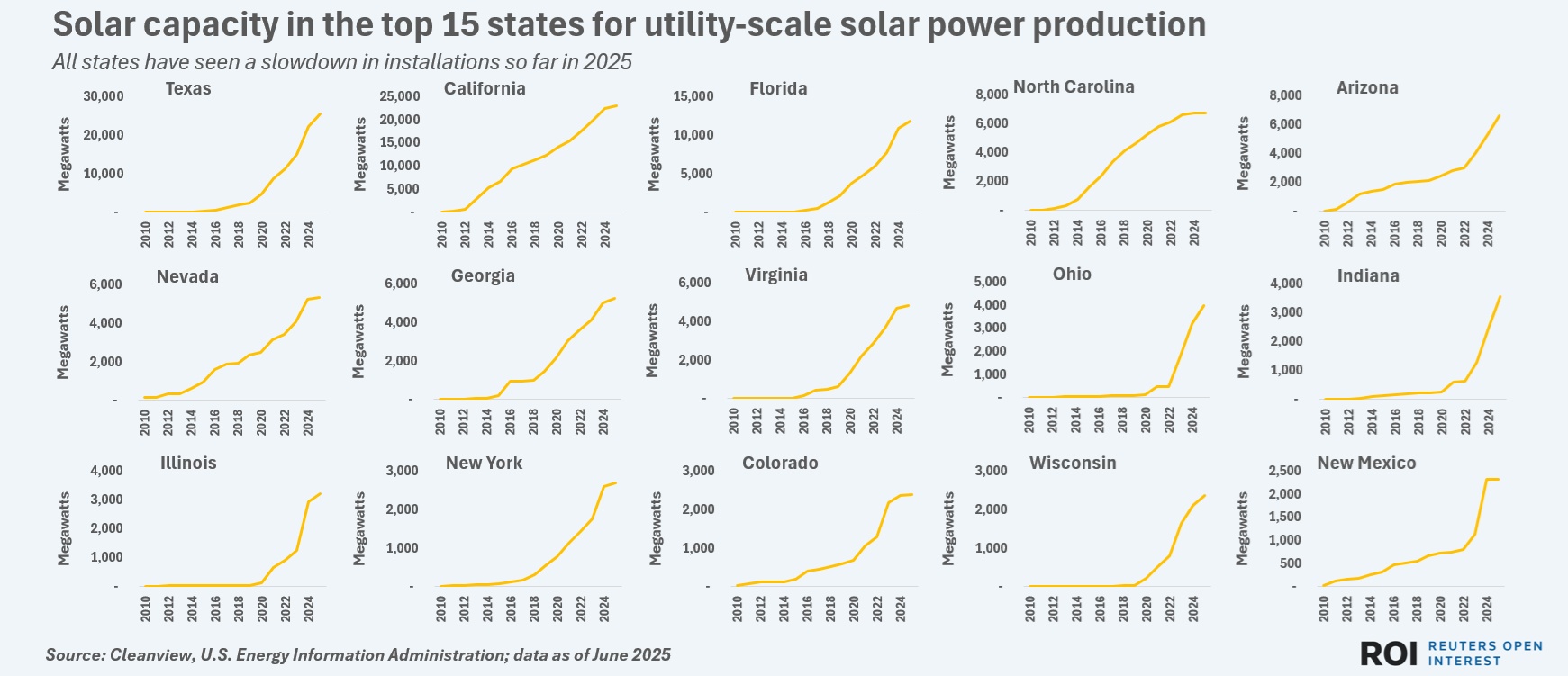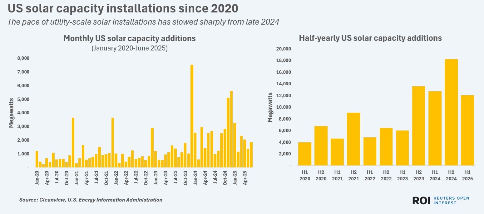 能源数据门户网站Cleanview的数据显示,截至2025年上半年,美国公用事业规模的太阳能系统装机容量同比增长约10%。这一增速远低于2024年的33%以及自2015年以来29%的年均增速。然而,考虑到特朗普政府对可再生能源的强烈反对立场,以及因此给电力开发商带来的政策不确定性,今年装机容量依然有所增加,这一事实将被清洁能源倡导者视为一项胜利。