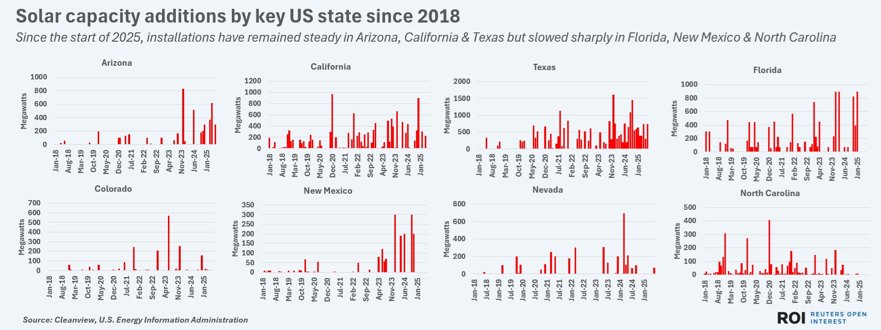 佛罗里达州的数据同样令人担忧,该州是美国第三大太阳能市场。从表面上看,今年迄今的扩张统计数据似乎不算太差,装机容量同比增长8%,达到接近12,000兆瓦的历史新高。然而,自1月以来,该州新增的公用事业规模太阳能装机容量为零,这表明自特朗普重新上任以来,该州公用事业公司扩大太阳能发电的工作可能已完全停止。