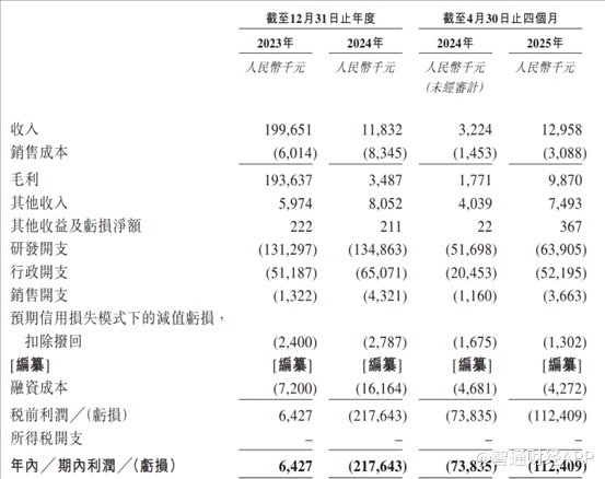 2023年、2024年及2024年前四个月和2025年前四个月,公司的营业收入分别为2.00亿元、1183万元及322万元和1296万元。同期,公司净利润分别为盈利640万元、亏损2.18亿元及亏损7384万元和亏损1.12亿元。
