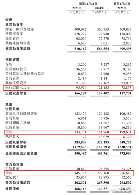从资产负债表来看,公司账面现金仅剩7283万元,而流动负债借款为2.00亿元,非流动负债借款2.57亿元,加一起4.57亿的负债。在扣除2025年前四个月的股份奖励开支等一次性开支以后,现金仅够四个月。