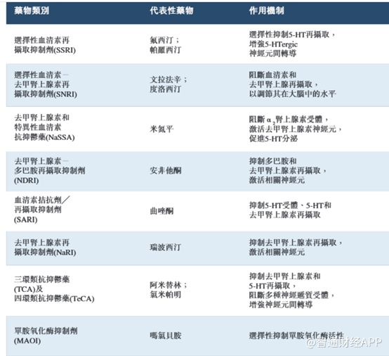 尽管三线治疗方案(包含单胺氧化酶抑制剂)受限于饮食限制和安全性问题,但其可用于治疗对一线和二线治疗方案无反应的患者。此外,传统中药已获批用于轻度至中度抑郁症的治疗,艾司氯胺酮在中国亦获批用于治疗抑郁症,但因其致幻性,其可能会被滥用。